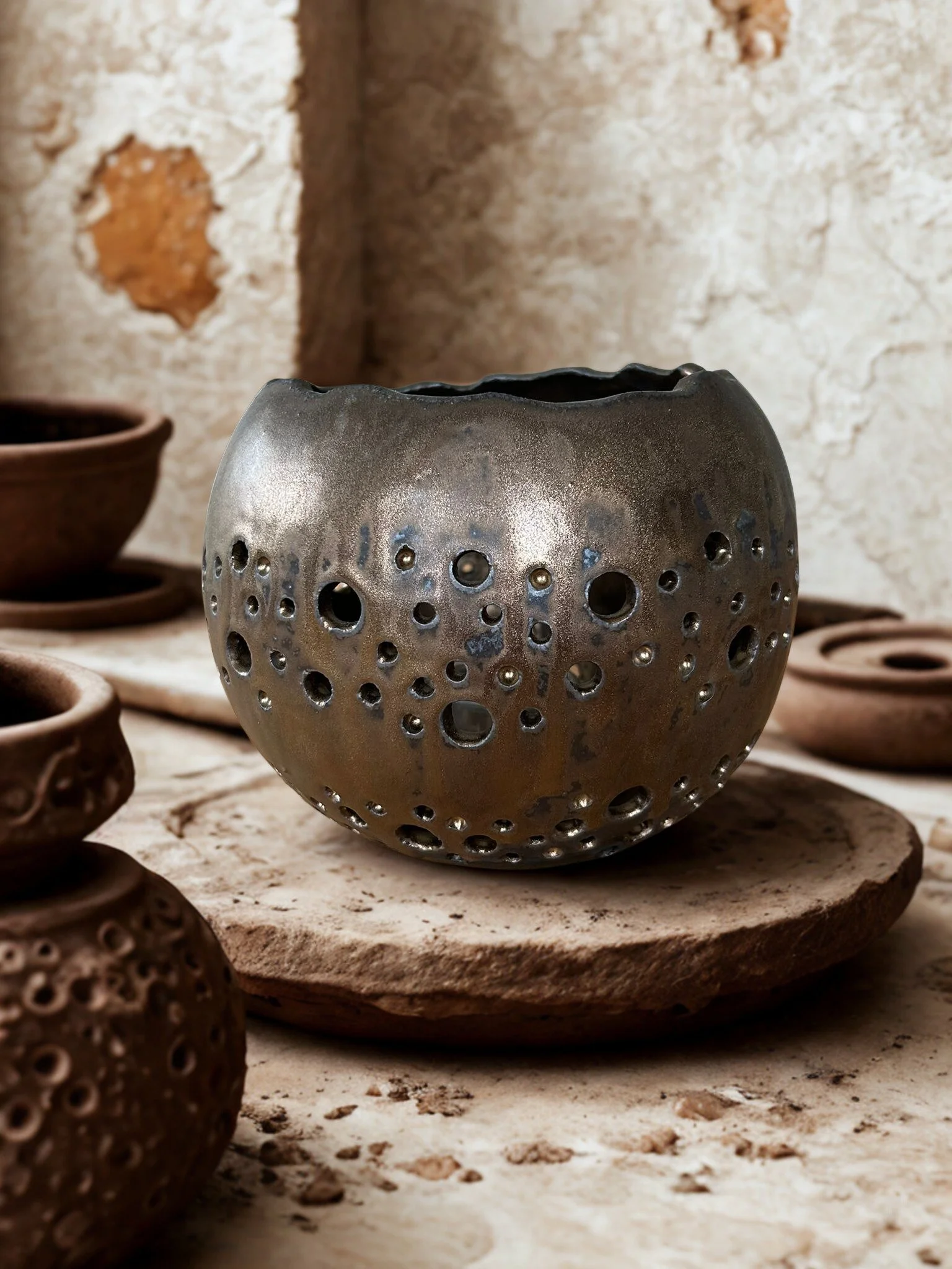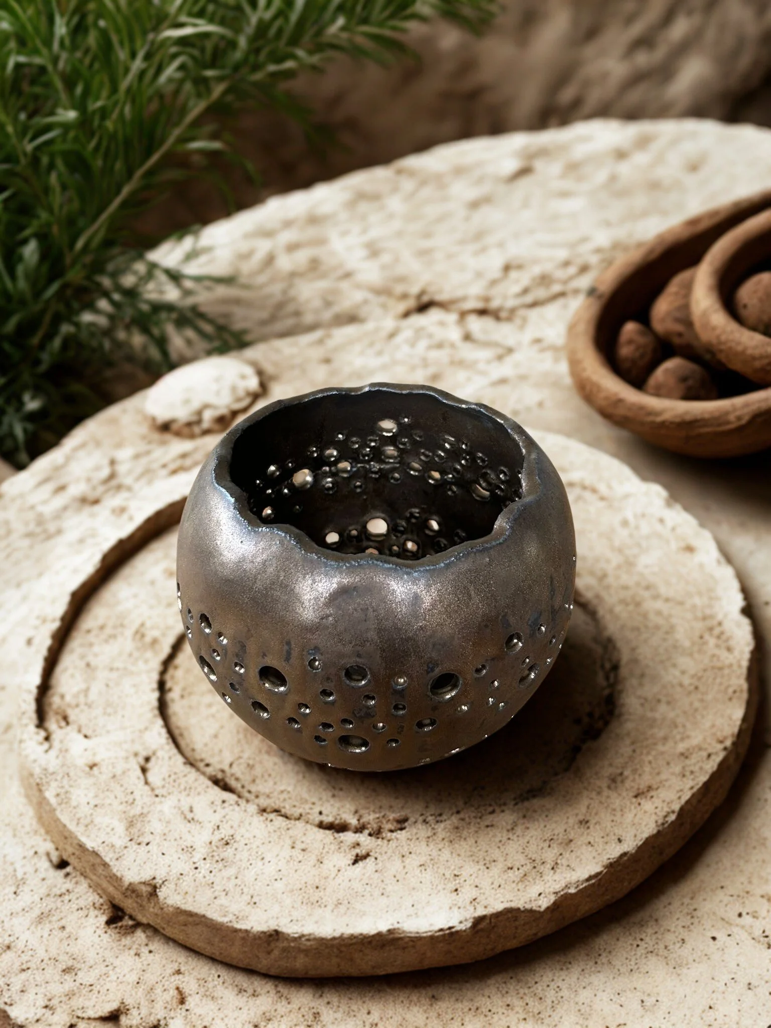 Handgetöpferte Lichtvase in dunklem Erdton mit rostigem Glanz