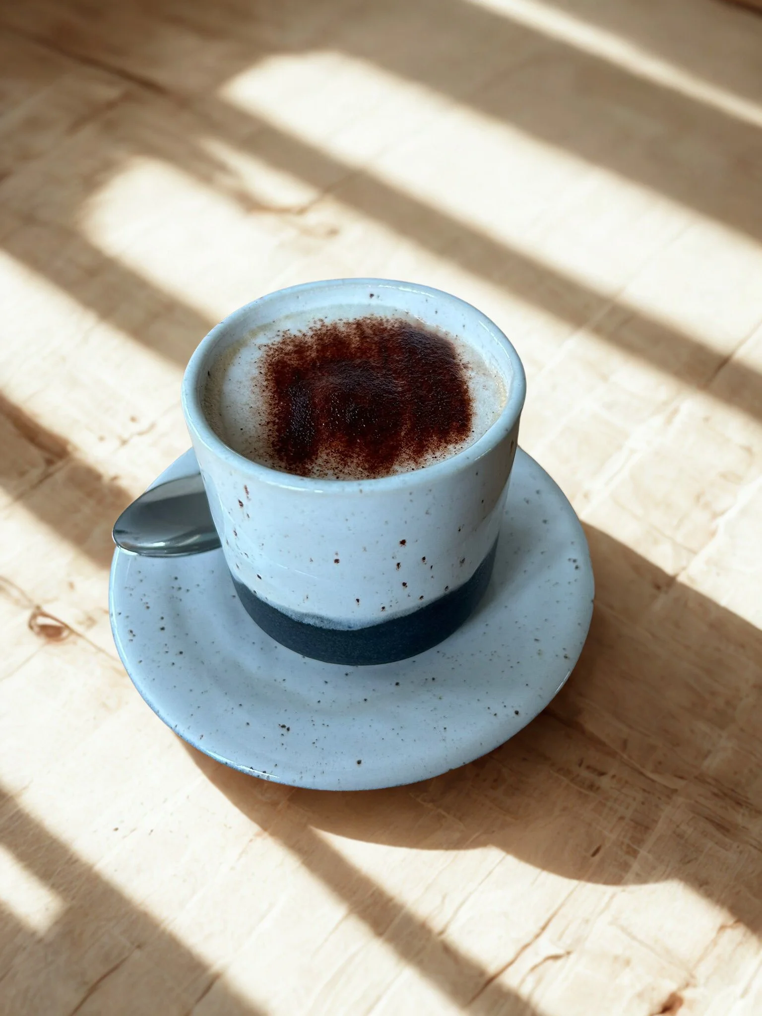 Handgetöpfertes Cappuccino-Set in sanften Beigetönen mit Tasse und Untersetzer