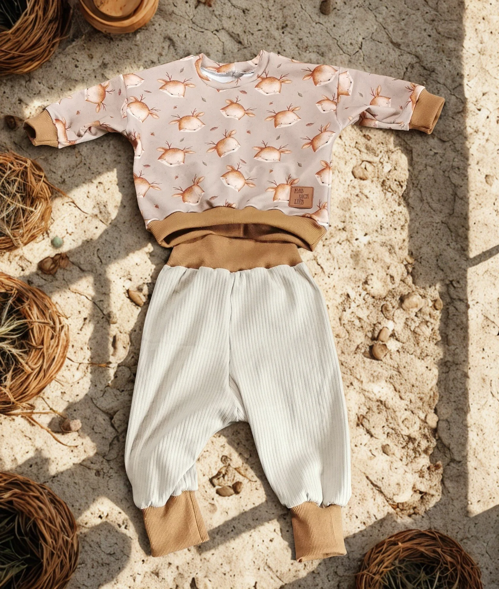 Weiches, handgenähtes Set aus Pullover und Hose mit zarten Rehsymbolen - perfekt für kleine Entdecker:innen