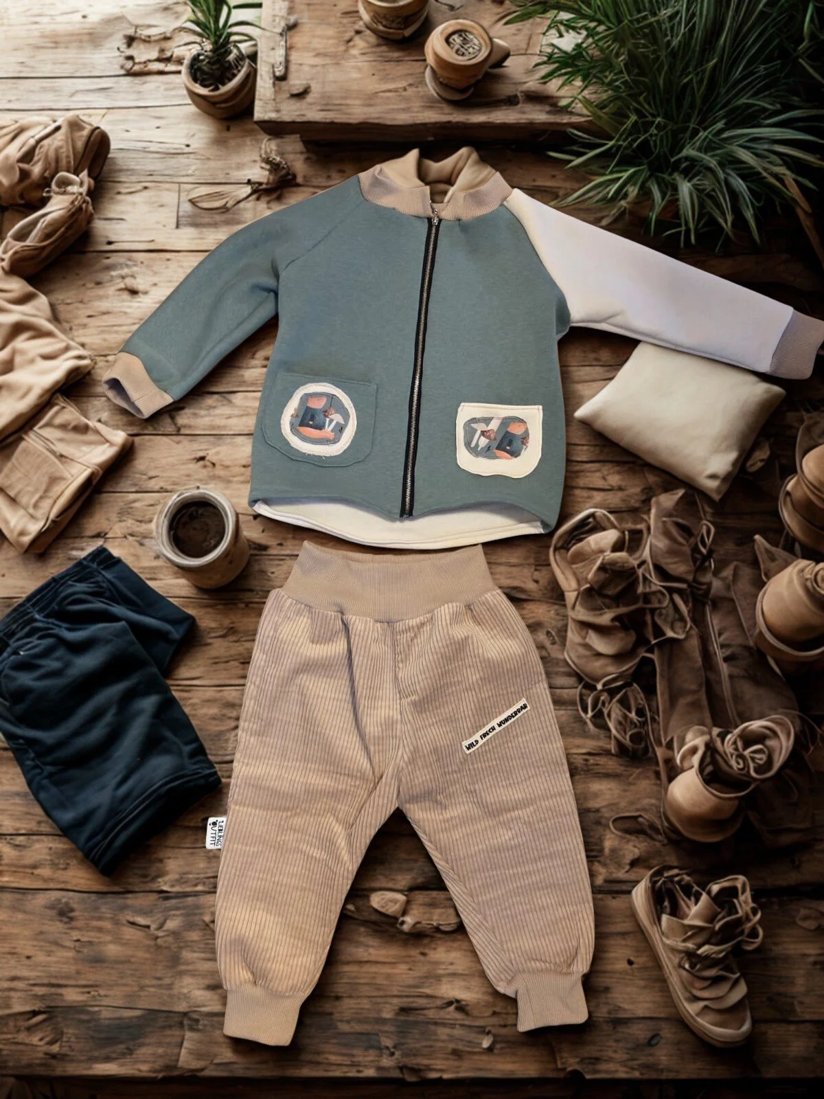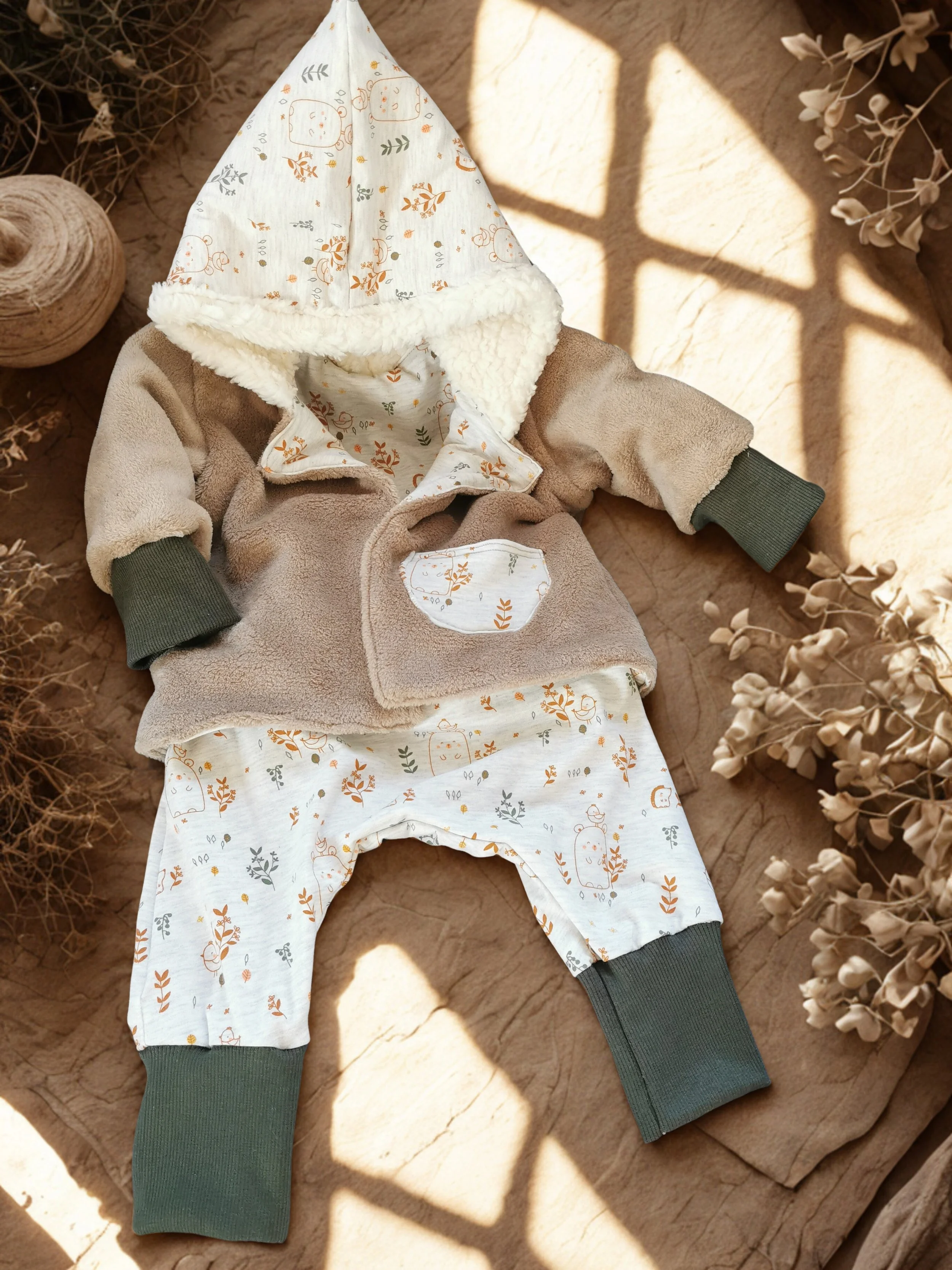 Weiches, handgenähtes Set aus Hose und passendem Jäckchen - perfekt für kleine Abenteuer und gemütliche Stunden