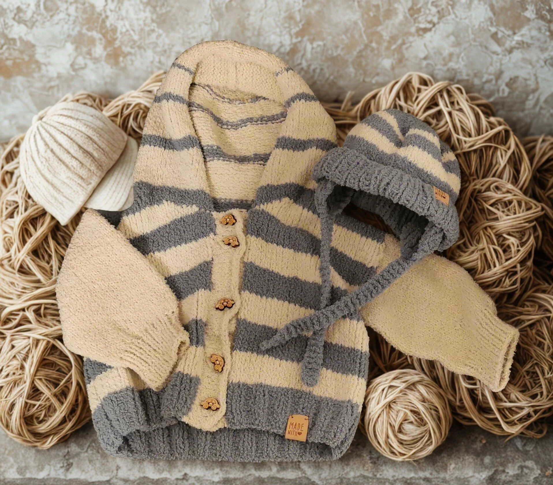 Selbstgestricktes Jäckchen mit passender Mütze
