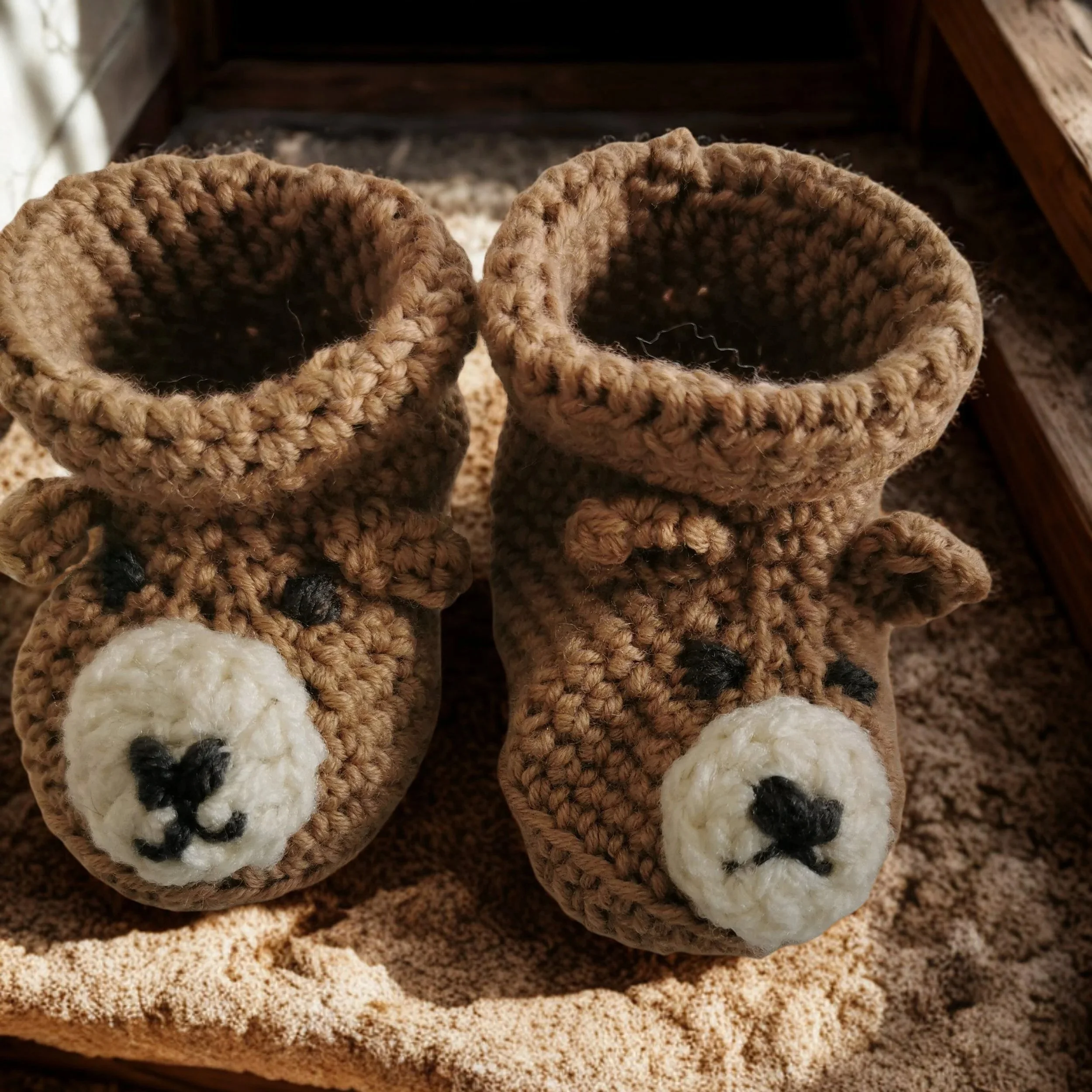 Selbstgestrickte Babyschühchen mit kleinem Bär
