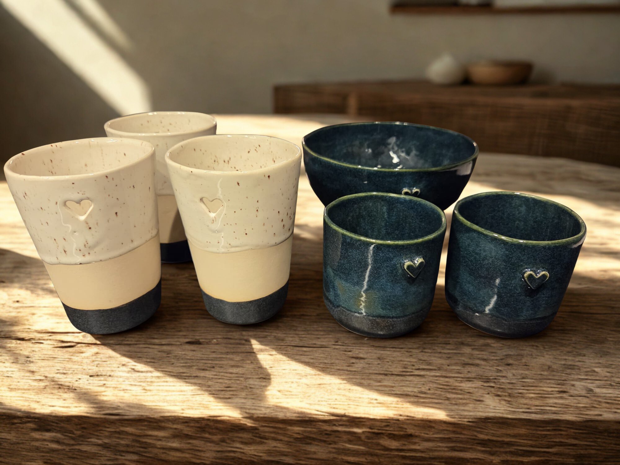 Eine Auswahl handgetöpferter Unikate – Mare Dip Bowl, Silent Dune Bowl, Honey Bloom Bowl & Blue Whisper – jede Schale einzigartig in Form, Farbe und Charakter