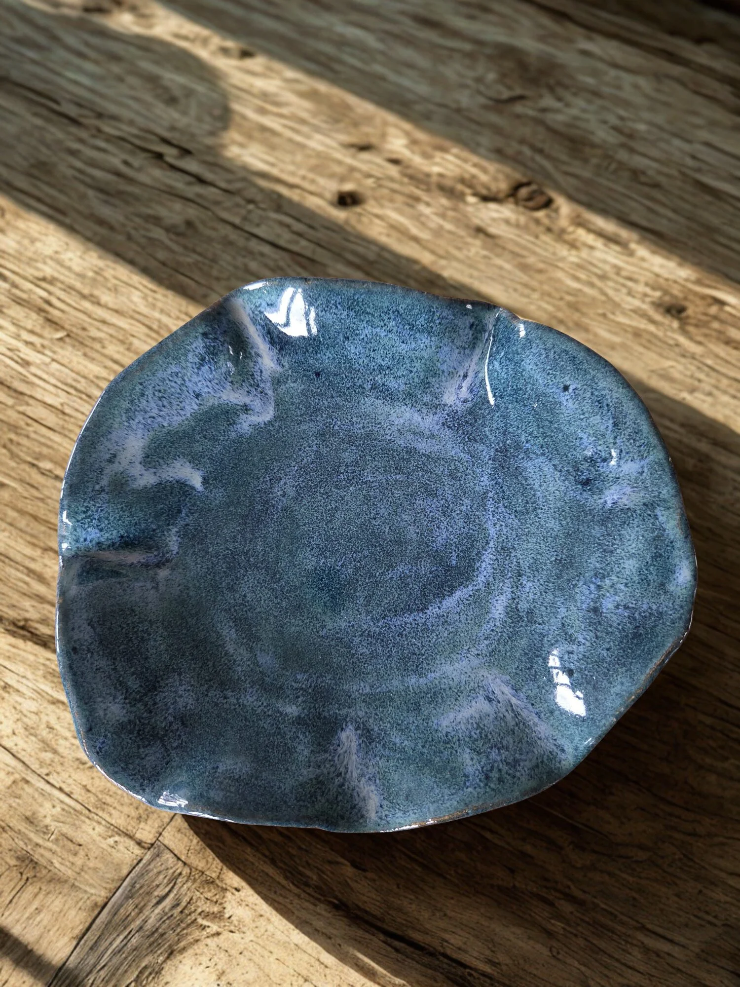 Aurelia Tide ist eine handgefertigte Schale, die die Magie von Wasser, Tiefe und sanfter Bewegung in sich trägt. Ihre organisch gewellte Form erinnert an vom Meer gezeichnete Küstenlinien, während die changierende Blau-Grün-Glasur wie fliessende Gezeiten wirkt – ruhig, kraftvoll und einzigartig zugleich.